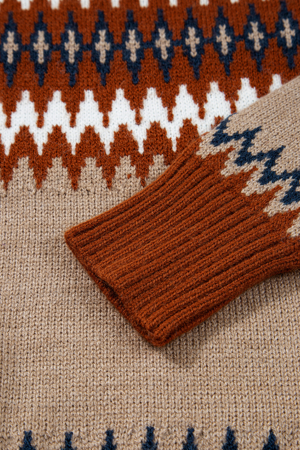 Add a touch of bold, bohemian charm to your cold-weather wardrobe with our Aztec Print Crew Neck Sweater. Featuring an eye-catching geometric pattern inspired by traditional Southwestern motifs, this sweater blends timeless style with cozy comfort. The classic crew neckline and relaxed fit make it perfect for everyday layering, while the soft knit fabric keeps you warm without sacrificing breathability. Pair it with jeans and boots for an effortlessly cool, laid-back look that’s perfect for crisp mornings and cozy nights.
