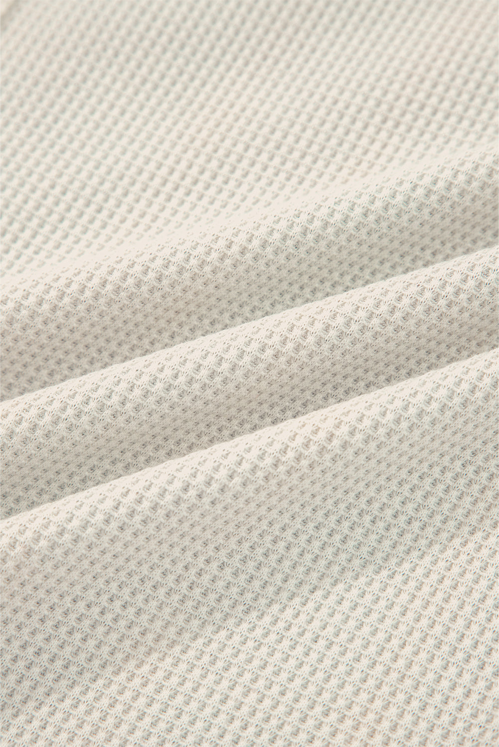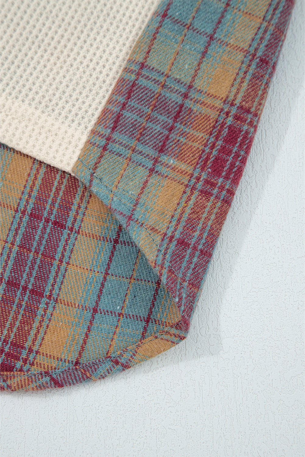 Add texture and charm to your everyday style with our Beige Waffle Stripe Plaid Patchwork Henley Knit Top. This unique top features a cozy waffle-knit base in a soft beige tone, accented with playful stripe and plaid patchwork details for a touch of rustic flair. The classic Henley neckline with button accents and the relaxed fit make it an easy go-to for laid-back days. Perfect for pairing with jeans or leggings, this top brings warmth, personality, and casual comfort to any outfit.