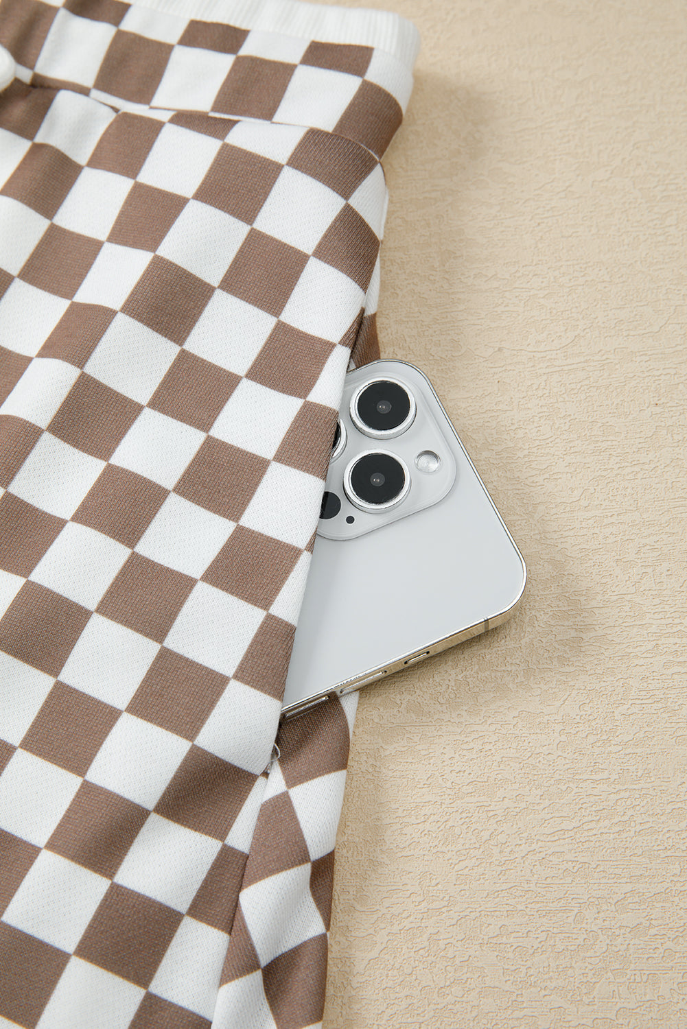 Step out in coordinated style with our Checkered Long Sleeve Top Drawstring Mini Skirt Set. Featuring a classic checkered pattern, the long sleeve top offers a comfortable, fitted silhouette, while the matching mini skirt is designed with a drawstring waist for an adjustable, flattering fit. Crafted from soft, breathable fabric, this set effortlessly blends playful pattern with modern comfort, making it perfect for casual outings or stylish weekend looks. Pair together or mix and match for versatile wardrobe options.