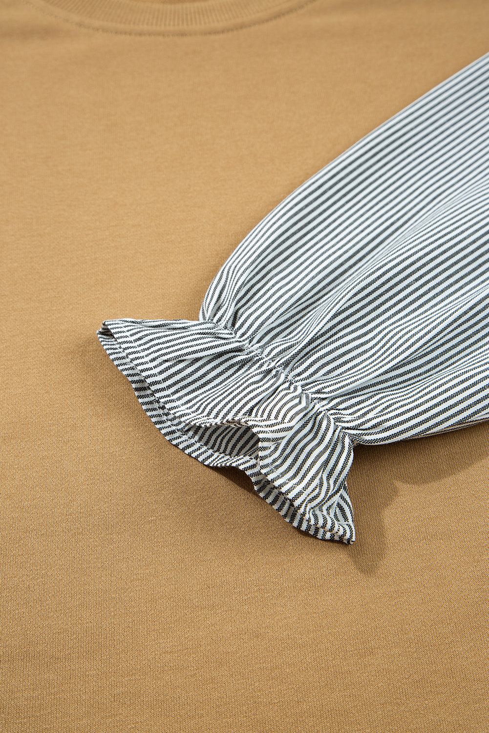 Embrace cozy elegance with our Camel Floral Striped Patchwork Ruffled Sleeve Crew Neck Sweatshirt. This unique sweatshirt blends warm camel tones with charming floral and striped patchwork accents, creating a beautifully textured and eye-catching design. The delicate ruffled sleeves add a feminine touch, while the classic crew neckline and relaxed fit ensure comfort and versatility. Perfect for layering or wearing solo, this sweatshirt effortlessly elevates your casual wardrobe with a playful, boho-inspired vibe.